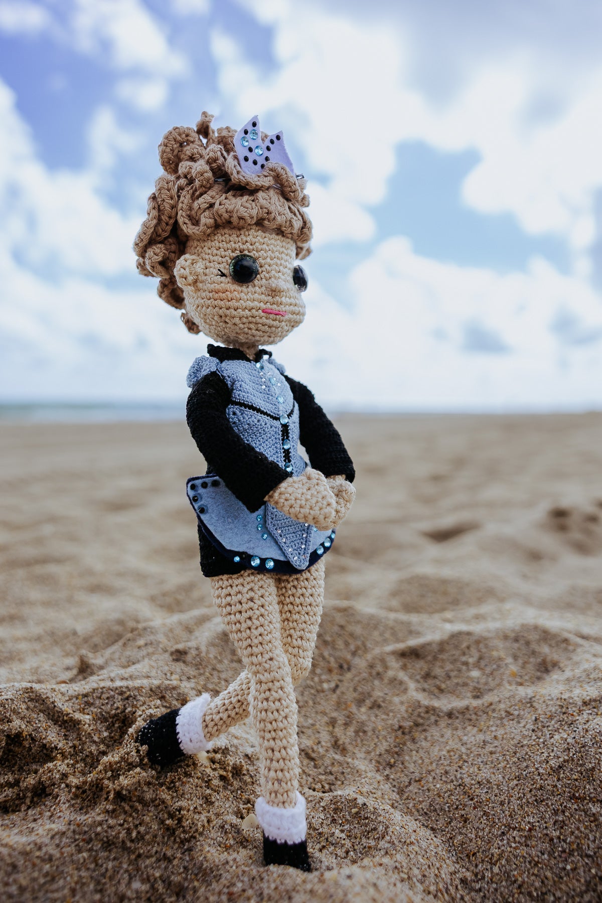 Ceol is the melody given form. Her face holds a listening, dreamy expression, as if hearing a tune only she can follow. Her dress is a symphony of cream and silver-grey, with curling, music-note inspired embroidery trailing from shoulder to wrist, representing the tune that guides the dancer's feet.